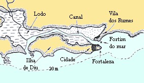 But the passage from Maim to Diu revealed more difficult than it seemed, due to contrary winds. Not managing to make way along the coast, the pilots advised D. Francisco de Almeida to go out to sea. However, after a few days, and finding themselves completely lost, the pilots declared that, already was not possible to reach Diu before the "monsoon", and to consider returning to Cochim. As one can imagine, D. Francisco despaired and had brought to his presence the pilots of some "naus of Mecca" that had been captured during the trip. One of them soon declared he would take the fleet to Diu if his freedom was granted. The Vice-Rei readily accepted and, in accordance with his advice and despite the skepticism of the Portuguese pilots, ordered the course changed to Southeast. On the dawn of 2nd day of February, Diu, in all its opulence, was in sight! ![]() Island of Diu Let us now see what happens, however, in the enemy field. After the battle of Chaul, celebrated by the "moors" as having been a great victory, Mir-Hocem and Meliqueaz had become heroes in the eyes of all the Muslim of India. However, in their soul, neither of them shared the euphoria of their coreligionists. Soon after the battle Meliqueaz had sent a letter to D. Francisco de Almeida bragging the courage of his son and friends and guaranteeing that the Portuguese prisoners, whom he had in his power, would be well treated, as they had really been. However, calculating correctly that this would not be sufficient to calm the anger of viceroi, he took care to strengthen the fleet by providing four well provided naus furnished with artillery, one of which of great size, and orders to construct and equip more fustas. In turn, Mir-Hocem, feeling equally insecure, does not spare efforts to repair his fleet from the damage suffered in Chaul. However, and despite the financial aid received from the "moors" of Diu, his situation was not brilliant. It is certain that he saw his fleet increase with the arrival of the galeon that was left behind when he left the Red Sea; but he lacked people; from one thousand five hundred men with whom he left Suez, two years before, only remained little more than eight hundred. To further increase the concerns of Meliqueaz and Mir-Hocem, from October it started to transpire in Diu that, after the "monsoon", in Cochim arrived numerous naus from Portugal, with many people of arms, which was the truth. From there both agreed to adopt the strategy to conserve the armies in Diu, leaving the initiative to the Portuguese. With the conquest of Dabul and the arrival of the letter of D. Francisco de Almeida all doubts faded, if they still had any. Meliqueaz and Mir-Hocem understood that they did not have a way to prevent a battle without quarter with the viceroi. The first cursed the hour when the Turks had decided to choose Diu for base of operations; the second, feeling that his partner would not hesitate in delivering him to save the city, only thought of finding a dandy way of being able to escape for the Red sea. The truth is that D. Francisco de Almeida had lead the psychological war as a true master and, through it, already had half the battle won before arriving at Diu. As soon as it transpired that the Portuguese fleet was nearby, Meliqueaz and Mir-Hocem had a meeting to decide what tactic to adopt. The Turk was of the opinion that they had to fight the Portuguese at sea to take advantage of the enormous numerical superiority that they had in rowing-ships: six Turkish gales and galeotas, about fifty fustas of Diu and as many paraus of Calicut, all very furnished with artillery and well provided with war hardened people. But Meliqueaz was categorically opposed , for he knew well that if things started to run badly, which seemed to be the most likely outcome, Mir-Hocem would not hesitate in beating in withdrawal for the Red sea, leaving him alone to account with the viceroi. Therefore, he insisted that they fought anchored, in order to benefit from the support of the artillery from the fort and the seaward fortress as well as what they had ordered to be placed on land, giving clear understanding to Mir-Hocem that if he left for sea neither his fustas nor the paraus from Calicut would follow him. But the astuteness of Meliqueaz did not stop there. With the excuse of his presence being indispensable in a war he was involved in the continent, he abandoned Diu, leaving to Mir-Hocem the prickly task of, alone, make the honors of the house to the viceroi! However, he was not a man to be outmaneuvered easily, as will be seen ahead. On the 2nd day of February, in the afternoon, when the Portuguese fleet anchored to the east of Diu, Mir-Hocem ordered an attack by the rowing ships, which resulted in a duel of artillery without consequence, given that the engagement was at great distance and the swell made it difficult to aim. After some time, the enemy ships ceased their attacks and went to anchor close to the coast, in the shallows that separate the outer harbour from the inner harbour. Shortly afterwards, they were joined by the four naus of Diu, by order of Mir-Hocem. Would he have had in mind to sacrifice Meliqueaz’s fleet to break the impetus of the Portuguese, before entering action with his own ships, or would he be thinking about, in the following morning, to also come with these out of the shallows? We will never know! Although absent from the city, Meliqueaz was kept up to date by couriers. As soon as he knew Mir-Hocem had ordered his fleet out of the shallows, he returned at a gallop and commanded that his naus and fustas, as well as paraus of Calicut, return to the inside. , The plans that Meliqueaz and Mir-Hocem had been deceiving each other, with failed in this way. The first was forced to remain in Diu during the battle; the second, was stopped from using the fleet of the other as a scapegoat.