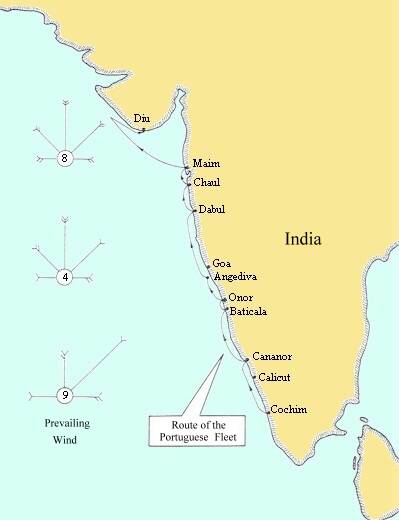 Rui Soares, one of the Portuguese Ship's Captains at the battle. Circa 1503: Portugal establishes feitorias (a trade/military fortress defending a safe harbour) for its fleets on the East African coast, on the route for its new fortified warehouses in India. There, the Muslims were no friends of the Hindus. In Goa, the Hindus were forced to submit to Islam or face death. To oppose the Portuguese expansion in the East, Mahmud Begara, sovereign of Guzerate, in India, enters into an alliance with the Sultan of Egypt and in early 1507 an Egyptian squadron is sent to India. March 1508: The egypto-guzerate forces surprise in Chaúl (Dabul) a small Portuguese fleet. After three days of combat two Portuguese ships manage to escape, while the remainder are taken, with casualties and hundreds of prisioners. Among the casualties is D. Lourenço, son of the Portuguese viceroy, D. Francisco de Almeida. The news of the death of D. Lourenço in the battle of Chaul enrages D. Francisco de Almeida as if lightning had struck at his feet. For some days he locked himself in his chambers, refusing to see or speak to anyone. Later, he returned to his normal life, as if nothing had happened. But, from behind his impassive countenance, one perceived that he burnt like a volcano about to blow, the desire for revenge. "He who ate the chick has to eat the rooster, or pay for it", he said. However, that year nothing could be done, with the "monsoon" about to arrive. During the wet season, he used the time to advantage, by successively careening all the ships that were in Cochim and fitting them, with sight to the operations planned for the end of the year. When the "good weather" returned, the first thing the viceroi did was to order Pêro Barreto with a fleet of three naus, six caravels and two gales to block Calicut, as he had been informed that the Samorim, the city's ruler, was organizing an army to join the ones of Mir-Hocem, Commander of the egypto-guzerate squadron, and Meliqueaz, Captain of Diu. The truth is that when Pêro Barreto arrived in Calicut, the paraus of the Samorim had already gone the way of Diu. In the Autumn of 1508, thanks to a happy coincidence, two fleets from the Kingdom arrived in India: the one from that year and the one from the previous year, that had wintered in Mozambique. Therefore, he had no lack of men, weapons and all other equipment necessary to equip the ships conveniently to go fight the moors. But, before thinking of war was necessary to deal with business. Up to the 20th of November, D. Francisco de Almeida was held in Cochim, overseeing the loading of the return-trip naus. On this date he left for Cananor with nine naus, two of which were cargo vessels, and one bergantim. Having dispatched the two cargo ships for Lisbon, the viceroi was preparing himself to join Pêro Barreto when what he feared most happened: on the 6th of December, Alfonso de Albuquerque arrived from Cananor and required him to deliver the government of India! D. Francisco de Almeida was in a dramatic situation of conflict. He knew he had no valid reason to disobey the King’s orders, but was not resigned to leave India without having avenged the death of his son by his own hands. Finally, the paternal feeling prevailed over discipline. Invoking futile reasons, adamantly refused to hand over the government before giving combat to the Turk (egypto-guzerate) raiders, now joined by local Muslim forces. In consequence, Alfonso de Albuquerque followed for Cochim and D. Francisco de Almeida, on the 12 of December, departed for Calicut.