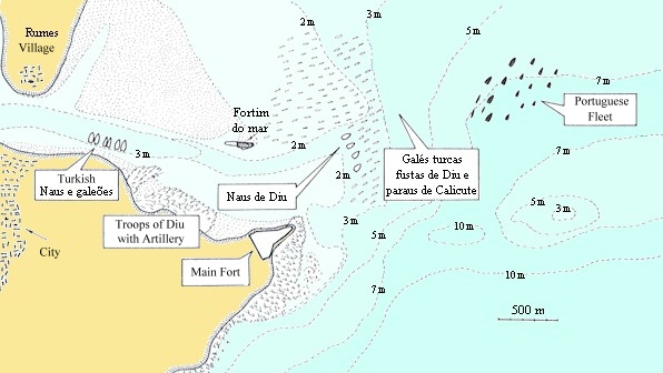 From a tactical point of view, it was a battle of annihilation that finds parallel only in Lepanto (1571), Aboukir (Nile-1798), Trafalgar (1805) or Tsuchima (1905). From a strategic point of view, it was not less important than any of these, much to the contrary, inasmuch as it assured the Portuguese, during almost a century, the freehold of the Indian ocean; it considerably lamed the power and prestige of the Turks, who were then the terror of Europe; it marks the beginning of a long period of domain of Asia by the Europeans, which only ended with the entrance of Japan in the Second World War.