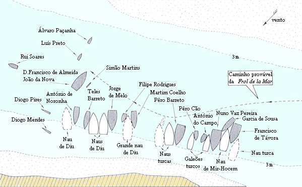 promise of freedom to the slaves. Finally, about eleven o’clock, having come together the ideal conditions of wind and tide, and having his people strongly motivated and anxious for action, D. Francisco de Almeida ordered a bombard to go off, which was the combined signal to initiate the attack. In all the ships, the trumpets and the drums filled the air with their martial tunes, at the same time that the garrisons came alive and made great commotion. On the enemy side, the naus and the rowing-ships had answered immediately in the same way. The great moment had arrived! The Portuguese naus, already short scoped , aweighed anchors, released jibs and mizzens, and headed, in the order, for the entrance of the channel, preceded by the gale of Diogo Pires that continuously sounded. The first nau to enter was the “Espírito Santo”, of Nuno Vaz Pereira, an old vessel, that leaked like a sieve and, therefore, was placed at the front, assuming that it could be lost, since the first ship to enter would be the one running the greatest risks. Effectively, as soon as the “Espírito Santo" and the gale of Diogo Pires entered the channel to the inner harbour they started to be shelled by the fortress, by the seaward fort and by the rowing-ships of the enemy, suffering heavy damage from all. Both the Turkish naus and the ones of Diu were heavily armored and with the castles and decks covered with strong nets of cairo. Moreover, they had the topsides protected by fenders consisting by bags of cotton covered with wet ox skins, because of fires. Moments before approaching the vessel of Mir-Hocem, the "Espírito Santo" let off all its portside cannons against the hull of the Turkish nau that was rafted to her starboard. The effect of this salvo, gone off at the shortest distance with cannons of thick bore, was devastating, opening a gap in the water line, through which water started to enter in great amounts, making the nau list dangerously. Trying to counterbalance the list, all its garrison transferred to the other edge. It is certain that the vessel straightened, but the water that had embarked also ran to this side and caused her to capsize, to the acclamations of the garrison of the "Espírito Santo"! Everything happened so quickly that few were the Turks that managed to save themselves from drowning. However, immediately after firing its artillery, the “Espírito Santo", with a greater draught than the Turkish naus, touched the bottom and was immobilized a few meters away from the nau of Mir-Hocem. Thinking that the Portuguese had purposefully grounded in that position to send their nau to the bottom with their artillery as they had done with the other, they hauled on the port iron's cable and grappled the nau of Nuno Vaz that, by the way, did not desire another thing. As soon as the two naus joined, the Portuguese jumped impetuously on the enemy ship and in a few minutes they had taken the forecastle and the deck. However, at the moment where it seemed that the Turkish flagship was irretrievably lost, one of the galleons, that was to port, shortened on the starboard anchor and boarded the "Espírito Santo" on the opposite side to the one grappled to the vessel of Mir-Hocem. In this way, it was our vessel stuck between two Turkish ships, seeing itself obliged to fight simultaneously with both. In result of this, part of the knights and soldiers who were in the vessel of Mir-Hocem had to return hastily to their vessel to defend from the attack of the galleon. During this, Nuno Vaz Pereira was seriously wounded by an arrow that crossed his throat and had to be evacuated in arms. From this moment, the garrison of the “Espírito Santo” was forced to adopt a defensive attitude, limited to repel the successive assaults of the Turks for both sides. The second vessel to enter should have been the "Belém", of Jorge de Melo Pereira. But it took too long to hoist the anchor. Pêro Barreto, in the “Great Taforea”, passed in front and crossed the channel without incident, headed for the Turkish nau that was her target, the third, which grappled to starboard. But, as this also had one other moored to itself, Pêro Barreto and his friends had to deal with, at the same time, the garrisons of two vessels, which made for a drawn out combat. Meanwhile, Jorge de Melo was furious for having been overtaken and couldn’t get enough of insulting the master! And, to try to recoup the delay, as soon as the iron pulled out, ordered the mainsail hoisted , besides the jib and the mizzen. The result was that the vessel gained speed and, before the sails could again be lowered, went past all the Turkish vessels and even the great nau of Diu, finishing up only managing to board, on starboard, the group of two naus of this city that were next! In this way was lost for combat with the Turks the best and most provided nau of our fleet. The fourth nau to enter was the Great King, of Francisco de Távora. In its wake went the "Frol of la Mar", of João da Nova, with the Vice-Rei. Seeing what happened with the "Belém" and realizing that the "Espírito Santo" was in difficulties, it is probable that he ordered Francisco de Távora, that preceded him, and Garcia de Sousa, that followed him, to board the vessel of Mir-Hocem, which they did. The arrival of the "Great Taforea" with fresh people made the combat in the Turkish flagship definitively hang in our favor. Although they continued to offer a desperate resistance, its occupants had been obliged to abandon the exterior and to take refuge below decks, where they all ended up being killed or made prisoner. Mir-Hocem, already wounded and seeing the nau lost, was transferred to a small boat that was moored by the poop and, using to advantage the confusion of the battle, crossed the channel without being noticed and escaped to the village of Rumes. There, he mounted a horse and ran away at a gallop for Cambaia, with more distrust of Meliqueaz than of the Portuguese. Howev